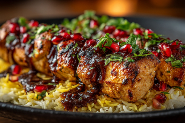 Фесенджун — это не просто соус. Это густой, тёплый, ореховый бархат, в который купается каждый кусочек курицы. Грецкие орехи, растертые почти в пасту, создают основу — кремовую, сытную, благородную. А гранатовый сироп вшивает в этот бархат тончайшие золотые нити сладости и лёгкой терпкости. Курица на шпажке — лишь повод, чтобы прикоснуться к этой роскоши.