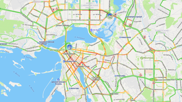 Согласно данным сервиса, самые сильные пробки сейчас в Вахитовском, Советском и Ново-Савиновском районе. В Приволжском, Московском и Кировском районах ситуация обстоит проще – большая часть улиц окрашена в желтый и зелёный.