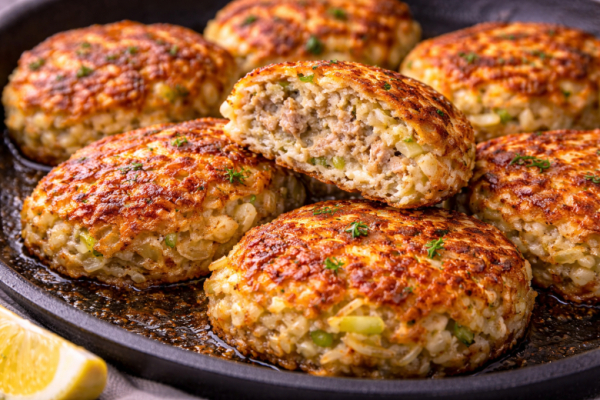 Сформировать небольшие плоские котлеты. Разогреть сковороду с растительным маслом и выложить заготовки. Жарить на среднем огне по 5–7 минут с каждой стороны до золотистой корочки.