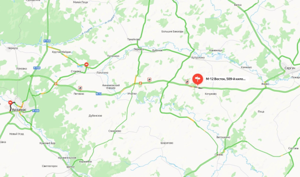 Как сообщает «Автодор», движение полностью перекрыто на 510-м километре трассы М-12. Съезд организован на 442 км автодороги.