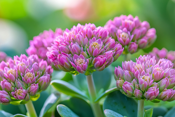 Этот суккулент накапливает влагу в мясистых листьях, поэтому его не нужно поливать, а также выдерживает и +40, и -30 градусов без всякого ухода. С середины лета до поздней осени растение украшает сад плотными щитковидными соцветиями, собранными из множества мелких розовых, малиновых или белых звездчатых цветков.