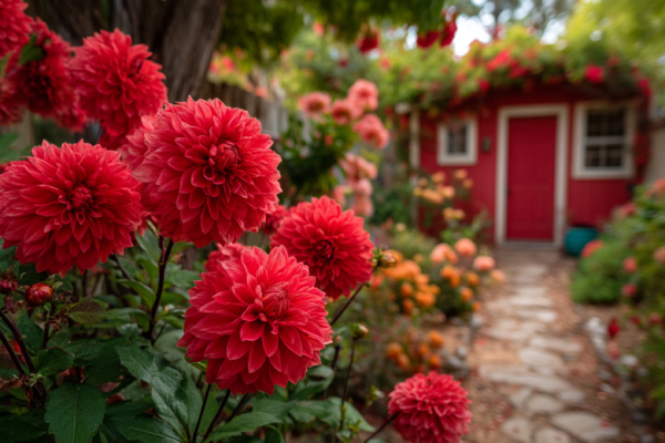 Его соцветия, достигающие 15-20 сантиметров в диаметре, буквально пылают насыщенным алым, бордовым или огненно-красным цветом, притягивая внимание своей величественной красотой и объёмом. Георгины невероятно выигрышно смотрятся как в одиночных посадках, создавая яркие акценты, так и в групповых, формируя настоящий цветочный фейерверк. При этом они достаточно неприхотливы: им нужно солнечное место, регулярный полив и защита от сильных ветров.